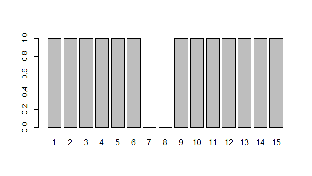 barplot(rbinom(15, prob = 0.75, size = 1), names.arg = 1:15)